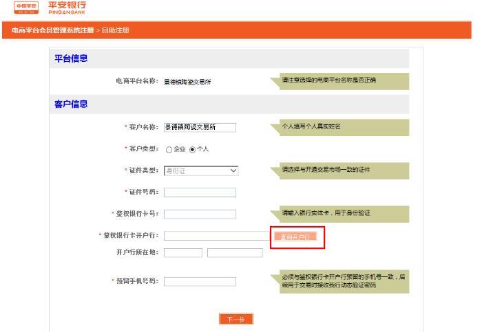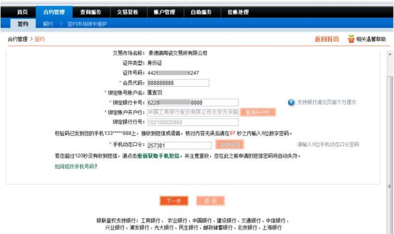 輸入會(huì)員在該交易市場(chǎng)的會(huì)員代碼、綁定銀行卡號(hào)、開(kāi)戶行、動(dòng)態(tài)口令,點(diǎn)擊“下一步”如圖: