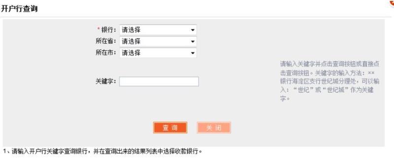 步驟二:選擇相應(yīng)的銀行開(kāi)戶行、所在省、所在市,可以通過(guò)關(guān)鍵字查詢
