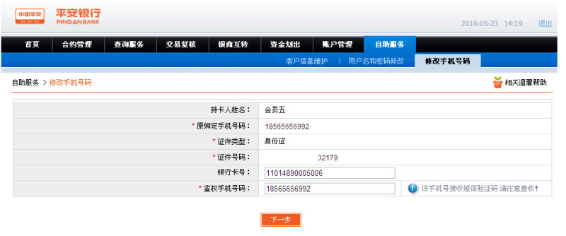 優化內容:個人會員通過“自助服務—修改手機號碼”交易進行手機號的修改。通過銀行卡號和預留手機號碼(此為需要修改在新手機號碼)進行銀聯鑒權,鑒權成功后,手機號碼修改成功。