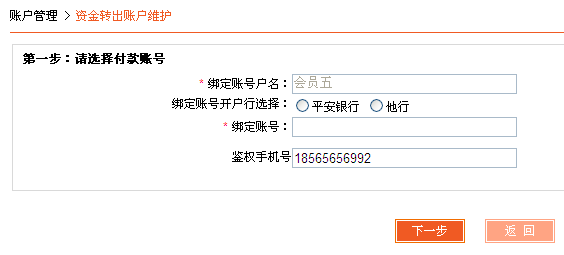 優化內容:個人會員維護資金轉出賬戶時增加銀聯鑒權功能(通過驗證戶名、證件類型(身份證)、證件號碼、銀行卡號、預留手機號碼),通過鑒權后,系統提示維護賬戶成功。