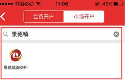 (4)步驟四:如未注冊“景德鎮(zhèn)陶瓷交易所”交易賬戶,則點擊“在線開戶”后,再次點擊“市場開戶”并搜索“景德鎮(zhèn)陶交所”,點擊圖標(biāo)進(jìn)入下一步;
