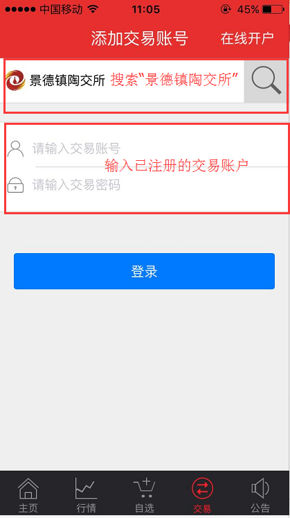 (8)步驟八:注冊“交易賬戶”成功后,返回步驟三,搜索“景德鎮(zhèn)陶交所”并輸入交易賬戶進(jìn)行登錄。
